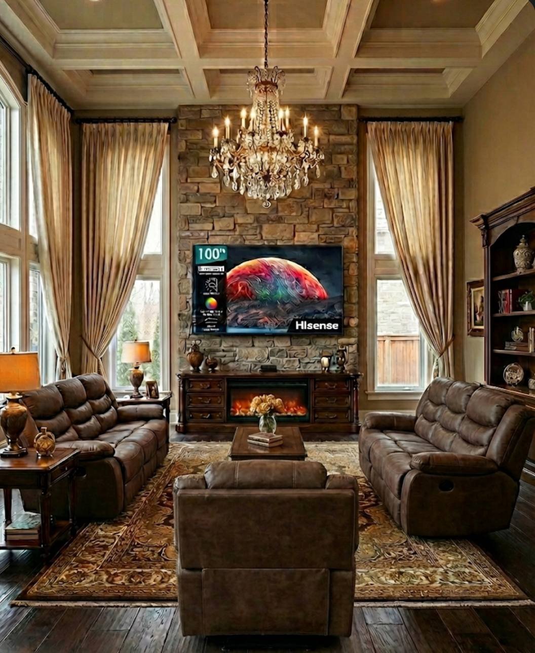 طقم كراسي إسترخاء – 8 أشخاص  + تلفزيون هايسنس ليزر مقاس 100 بوصة + طاولة تلفاز